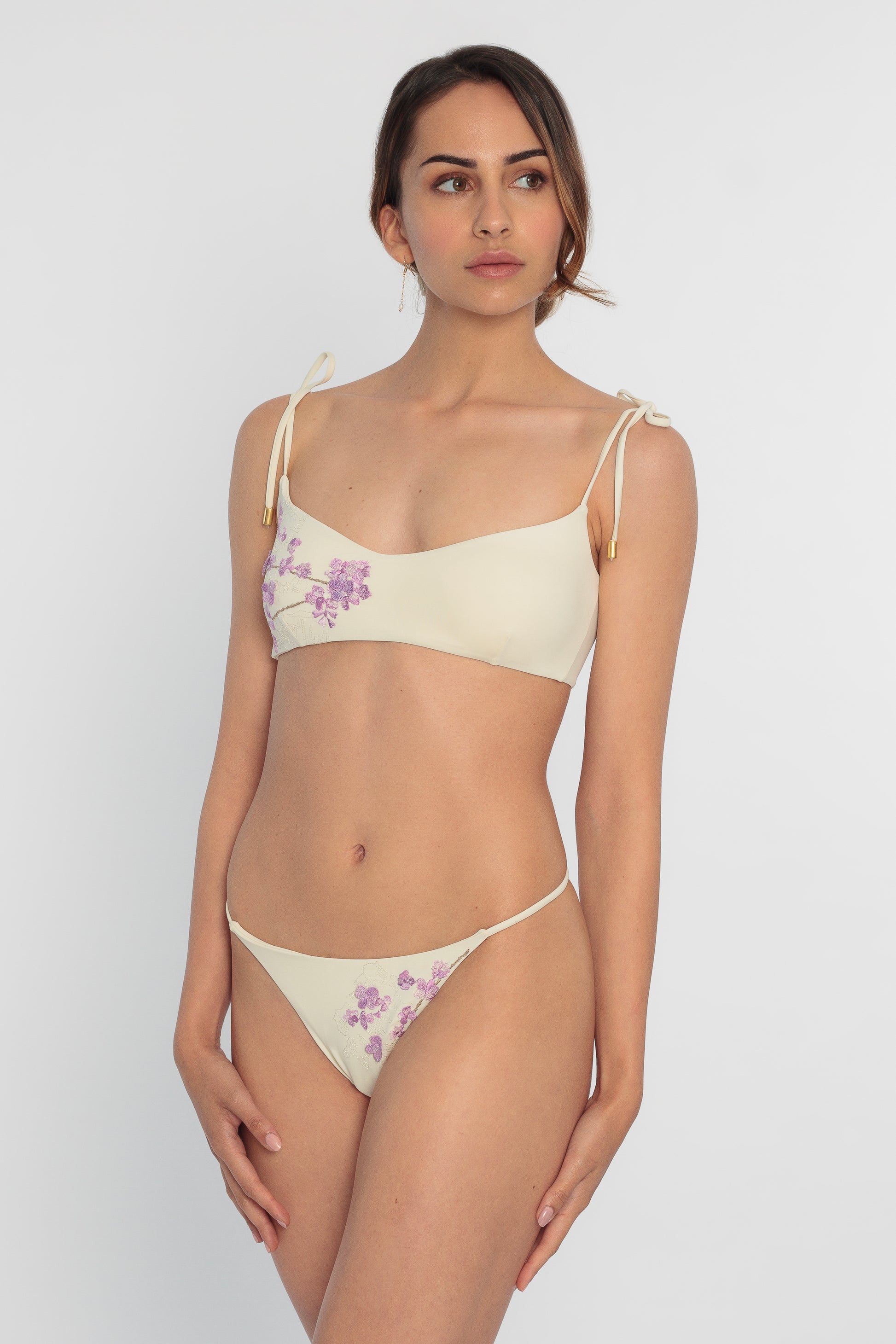 Ivory bikini with lavender embroidery. 100% Made in Italy fabric (86% Polyamide 14% Elastene).