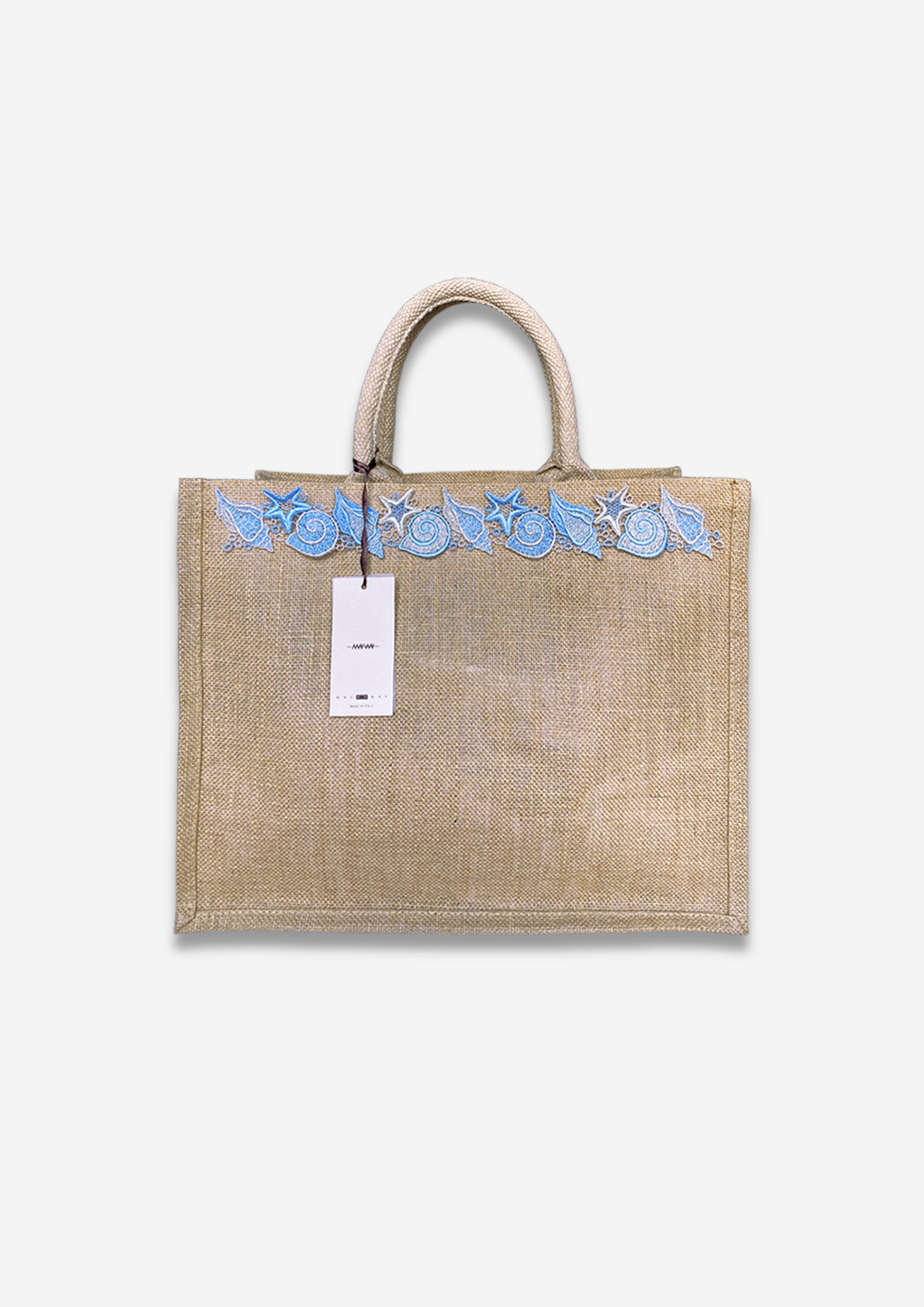 Borsa in Juta mis. Large (L42xH33), 100% naturale e Made in Italy, ornata di due nappine abbinate al ricamo e piccoli charm a tema marino. Possibilità di personalizzazione con la vostra opzione di scelta della lettera preferita. E' completa di sacca interna colorata ed estraibile da portare con sè!