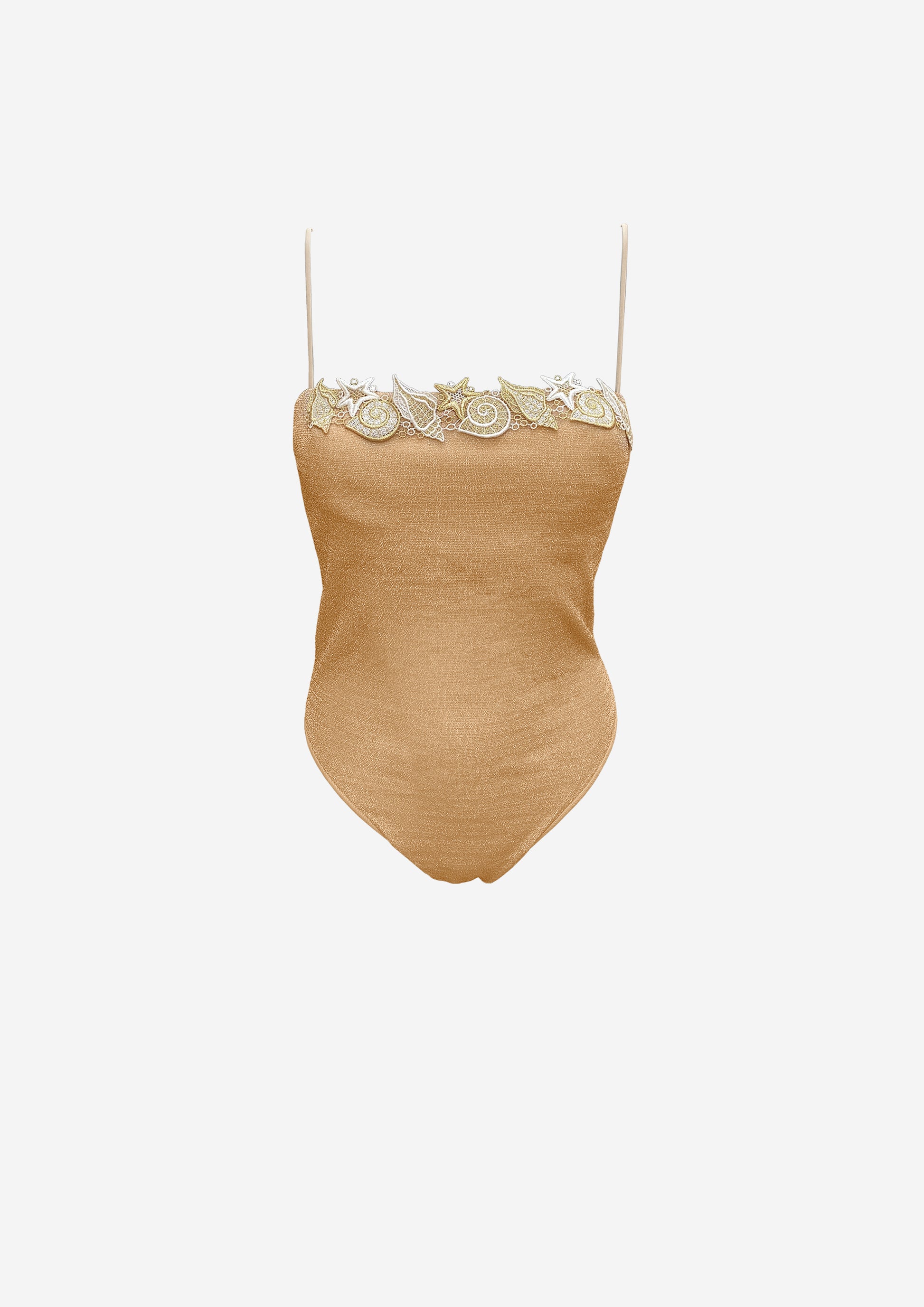 Lena, Made in Italy, costume da bagno intero in lurex oro con ricamo marino.