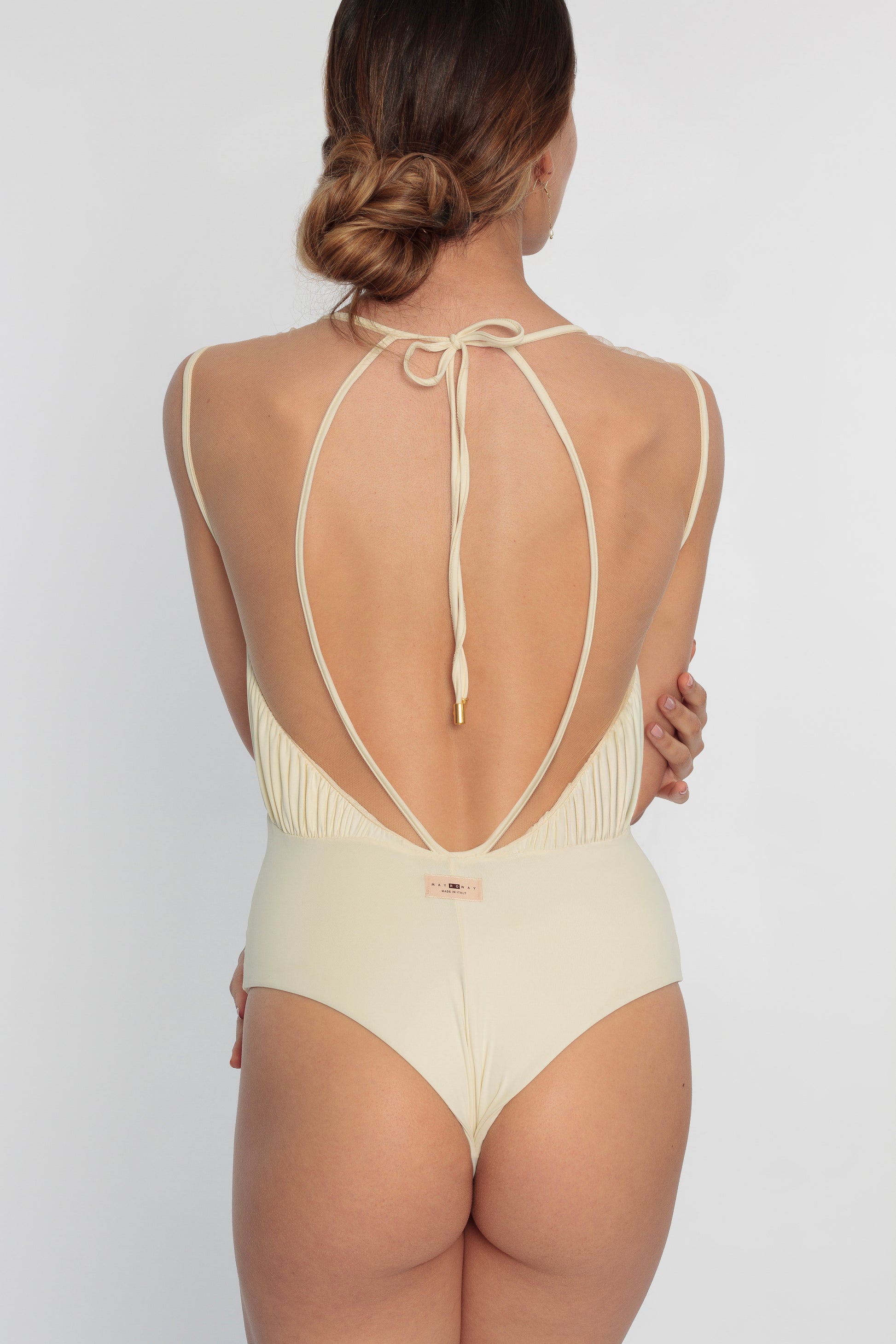 Tessuto 100% italiano (86% Polyamide 14% Elastene), coprente e con drappeggio superiore nel davanti fino alla schiena. Tulle leggero, 100% Nylon, color oro ad effetto invisibile e bordato in lycra.