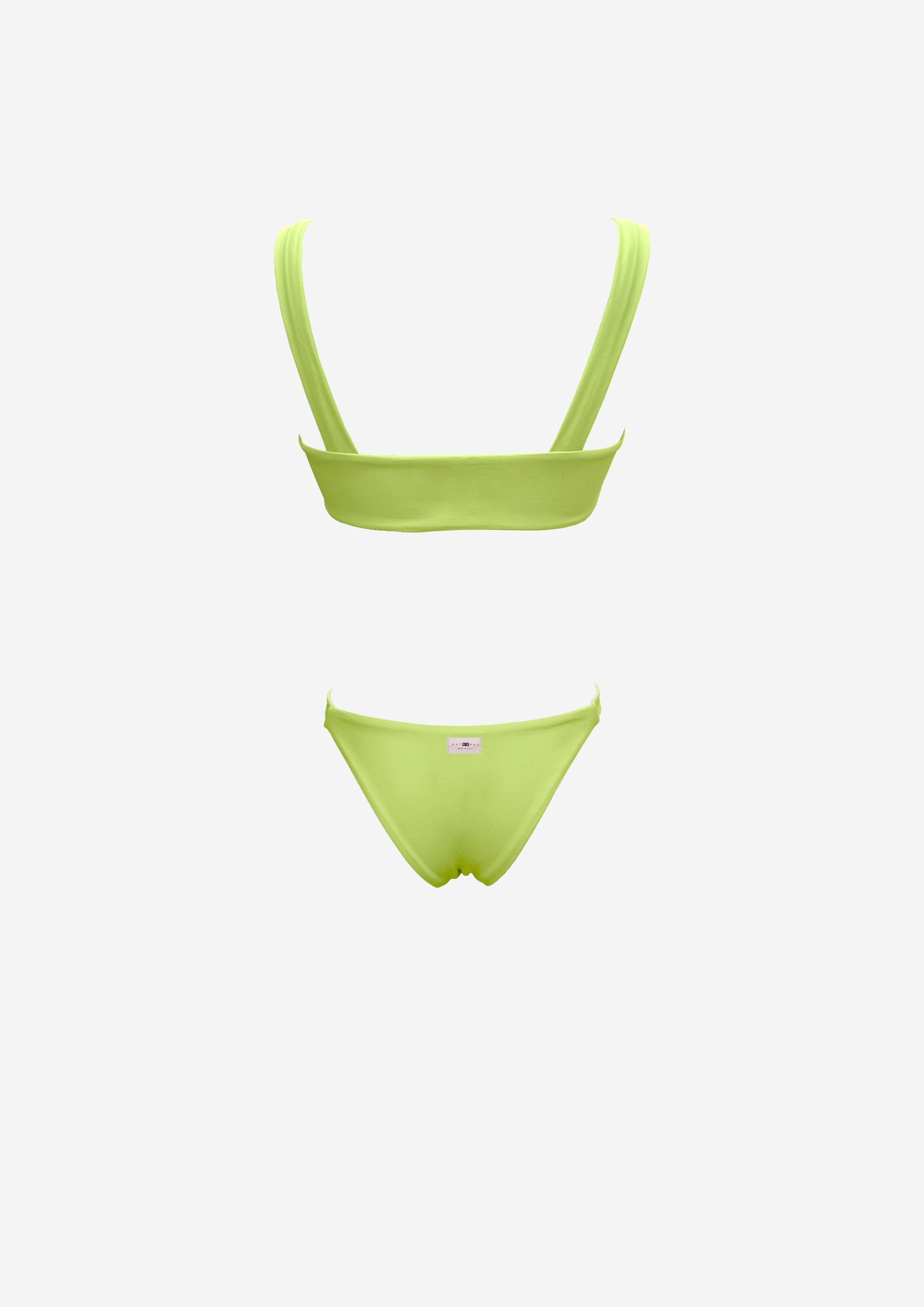 Selene, Made in Italy, bikini Verde Lime con ricamo marino in lurex argento/verde lime su top e lato slip. Tessuto 100% italiano, coprente.