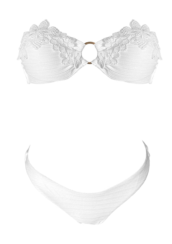 COMPRA ORACHICHI, Made in Italy, bikini a fascia bianco con ricamo floreale.